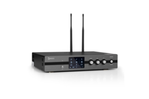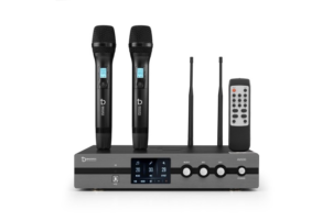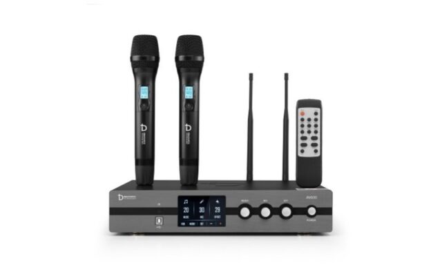 - Micro không dây hiện đại: Bộ sản phẩm đi kèm 2 tay micro không dây cao cấp, làm bằng hợp kim phủ nano chống trầy xước, chống bám vân tay. Trên thân micro tích hợp màn hình LCD nhỏ hiển thị tần số, dung lượng pin, và nút nguồn mềm, tạo sự tiện lợi tối đa khi sử dụng.