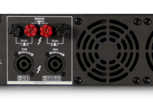 Features include RCA and XLR inputs, user selectable input sensitivity of 0.755V or 1.4V, Speakon® and binding post outputs, stereo/parallel/bridge-mono mode, power/fault/signal presence/clip indicators, forced-air cooling; and protection against shorts, no-load, on/off thumps and radio-frequency interference.